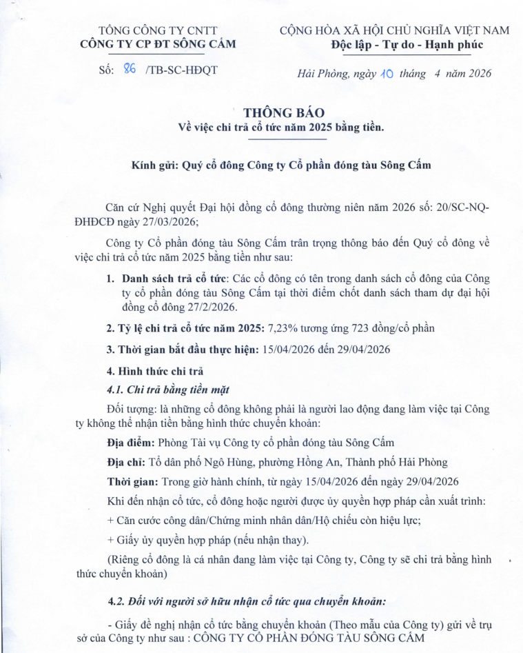 Công ty cổ phần đóng tàu Sông Cấm trân trọng gửi tới quý Cổ đông Thông báo số 86/TB-SC-HĐQT Về việc chi trả cổ tức năm 2025 bằng tiền.