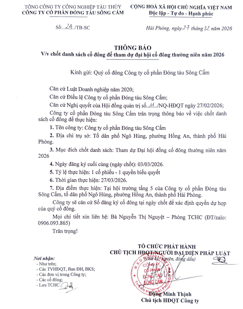 Công ty Cổ phần đóng tàu Sông Cấm trân trọng thông báo số 24/TB-SC ngày 27/02/2026, về việc chốt danh sách tham dự Đại hội Cổ đông Thường niên năm 2026.